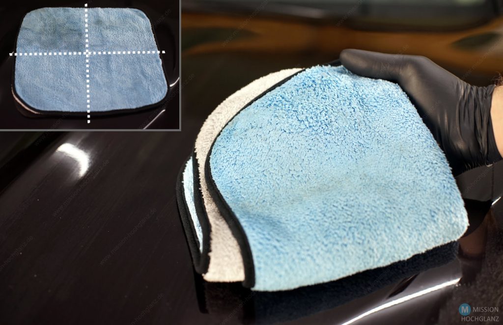 Um zu verhindern, dass der im vorderen Bereich des Microfasertuchs aufgenommene Schmutz oder gar Sandkörner den Lack zerkratzen, sollte der Auflagedruck aus der Tuch immer weiter nach hinten verlagert werden. Wenn die Handfertigkeit es erlaubt, lässt sich das durch eine stetige Abrollbewegung der Handfläche bewerkstelligen. Auf diese Weise sorgt ihr dafür, dass die verschmutze Fläche keinen Kontakt mit Lack bekommt und stets saubere Fasern zum Einsatz kommen.